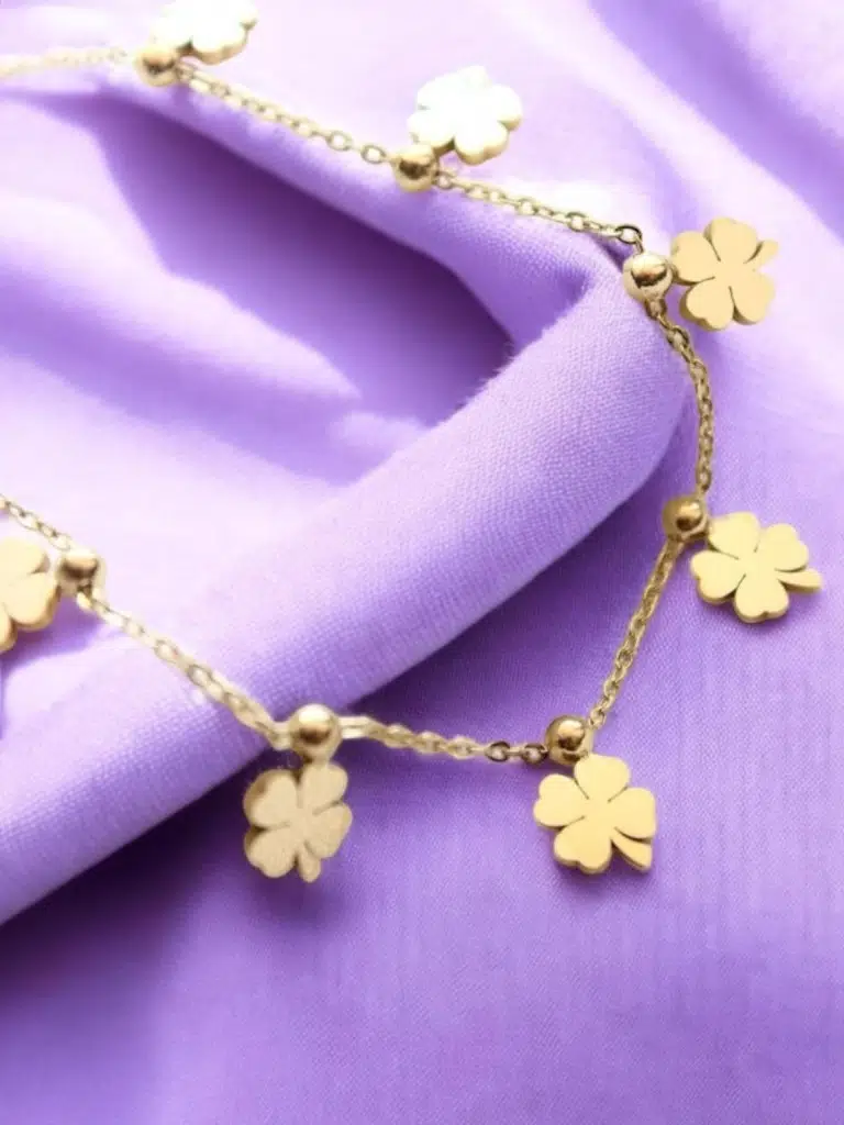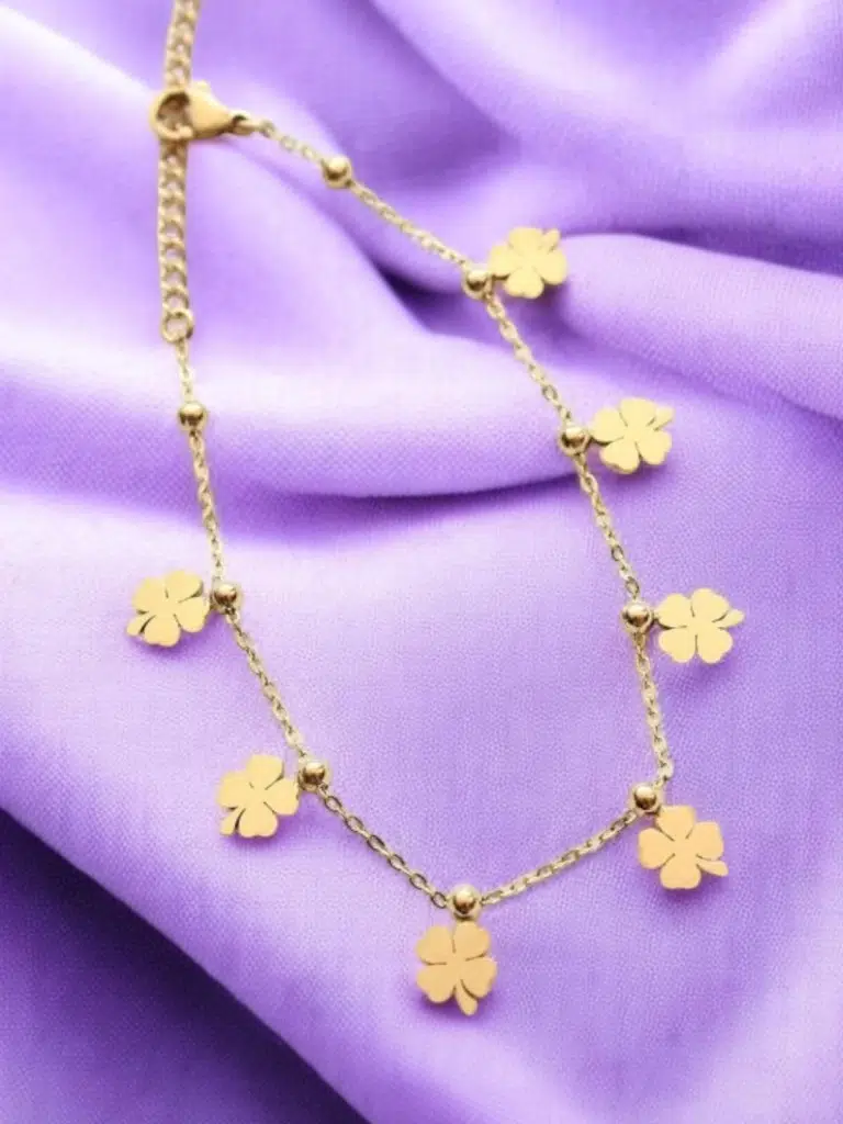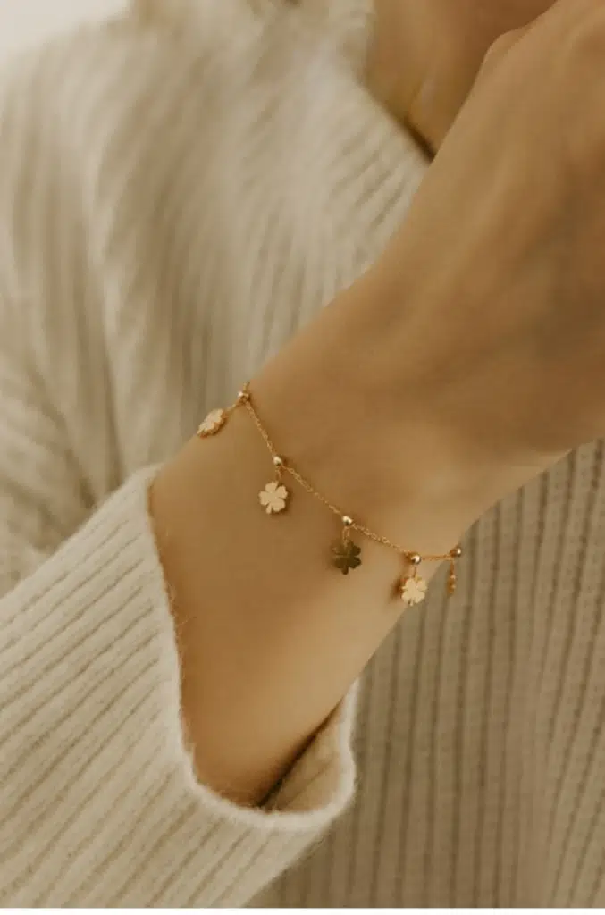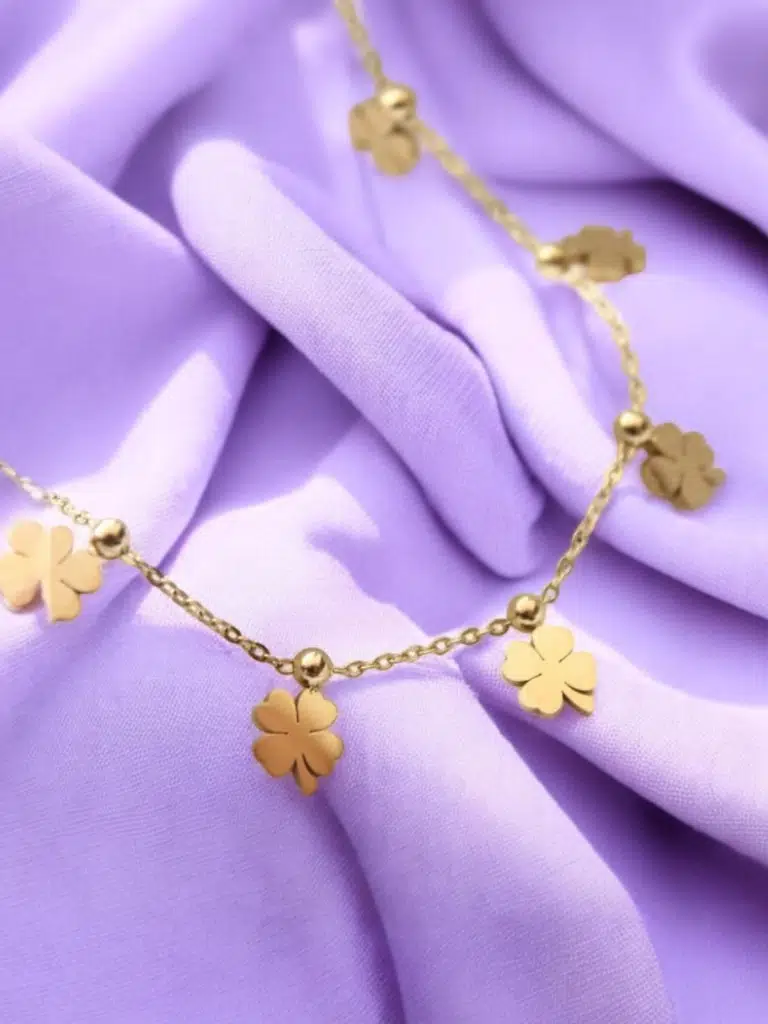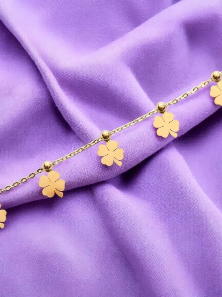 Altın renkli zincir üzerine hareketli dört yapraklı yonca figürleriyle tasarlanmış bu zarif kadın bileklik, şıklığı ve zarafetiyle stilinize şans katıyor. Paslanmaz çelikten üretilmiş olup kararma ve renk atma yapmaz, uzun ömürlü kullanım sağlar. Günlük hayatta rahatlıkla takabileceğiniz gibi özel günlerde de zarif kombinlerinizi tamamlayacak mükemmel bir aksesuardır. Aynı zamanda şık ve anlamlı bir hediye alternatifi olarak da öne çıkar.