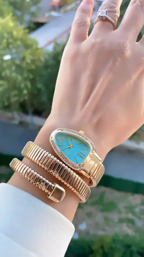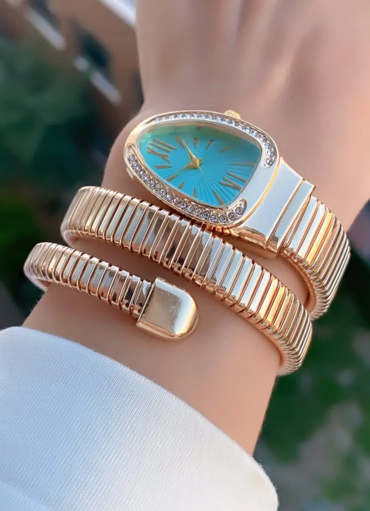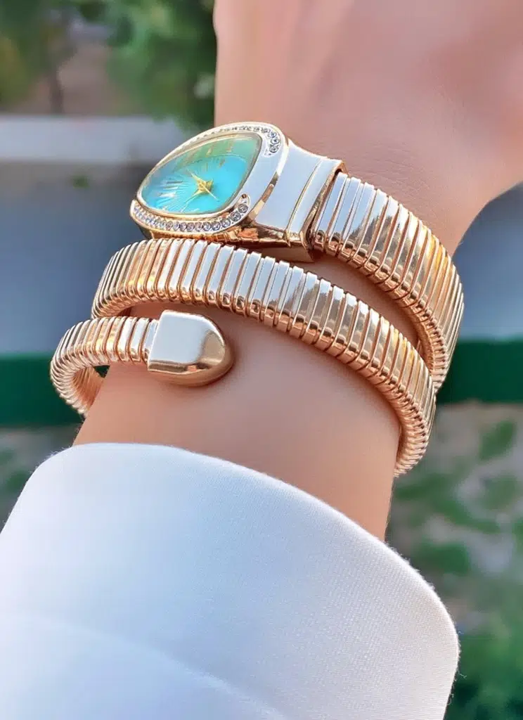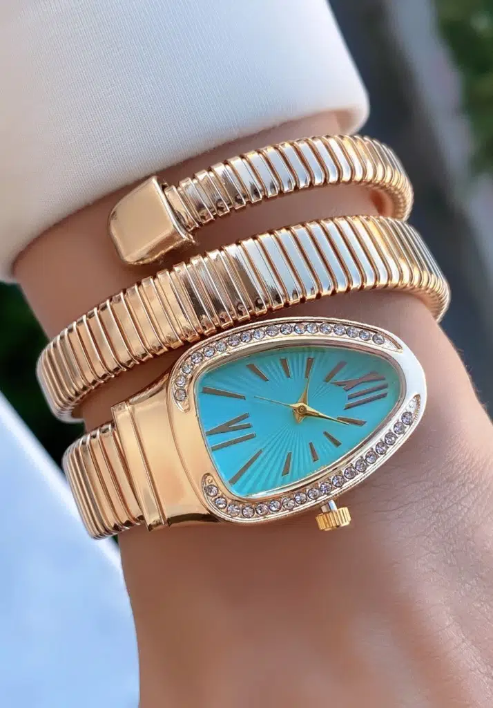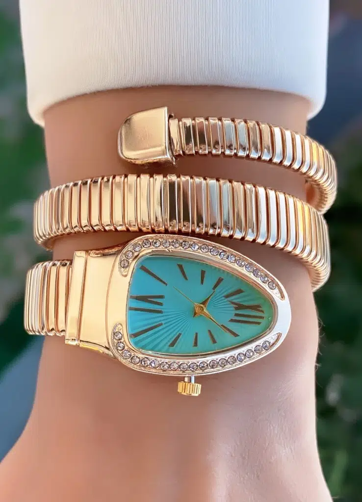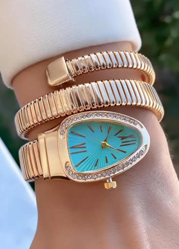 Altın Renk Turkuaz Kadran Yılan Saat, Dolamalı Saat, Kadın Kol Saati