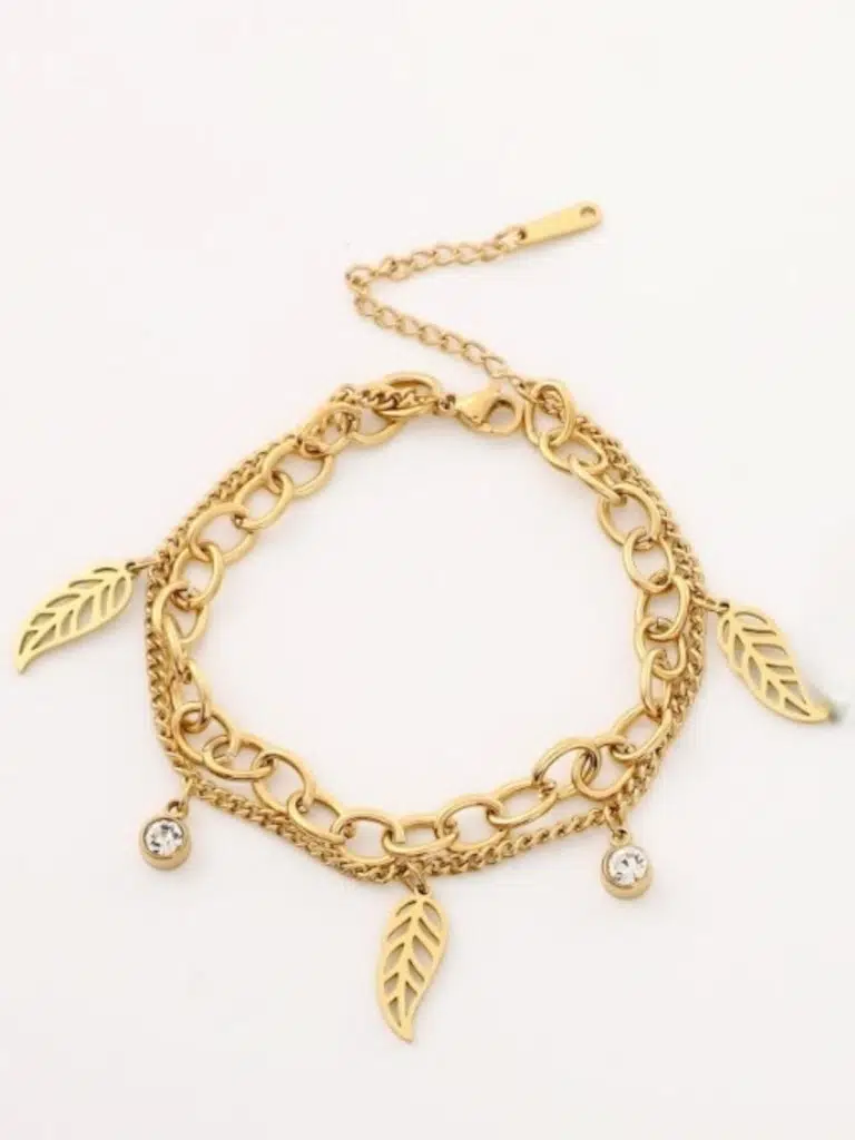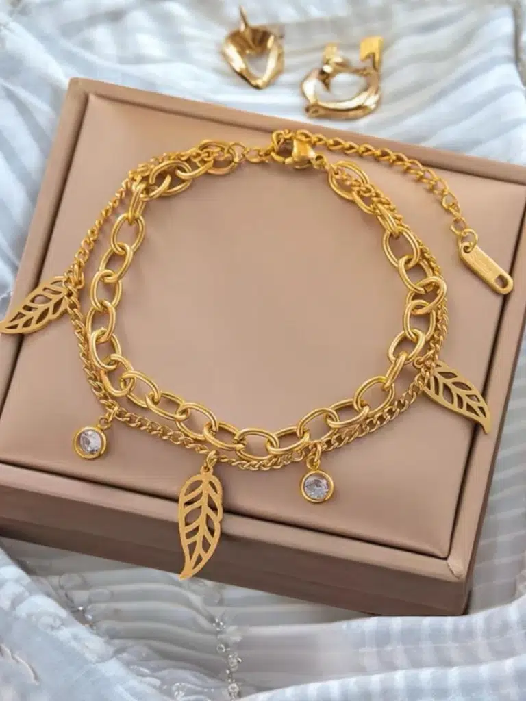 Şıklığı ve zarafeti bir araya getiren bu altın renk yaprak figürlü zincir bileklik, kadınların tarzına sofistike bir dokunuş katıyor. Çift zincir tasarımıyla modern görünüm sunarken, yaprak motifleri ve parlak taş detaylarıyla dikkat çekiyor. Hem günlük kullanım hem de özel davetlerde rahatlıkla tercih edilebilir. Paslanmaz çelik yapısı sayesinde kararma yapmaz, uzun süre ilk günkü ışıltısını korur. Ayarlanabilir yapısı ile her bileğe uyum sağlar, zarif kutusuyla hediye seçeneği olarak da idealdir.