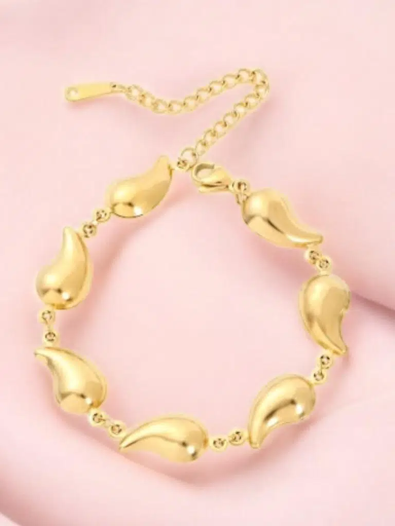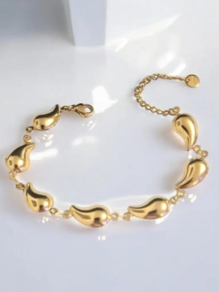 Modern tasarımıyla dikkat çeken bu altın renkli damla desenli bileklik, günlük kombinlerden özel davetlere kadar her stile uyum sağlar. Parlak yüzeyi ve zarif detaylarıyla bileğinizde göz alıcı bir duruş sergiler. Dayanıklı yapısı sayesinde uzun süre kullanılabilir. Kadınlara özel şıklığı tamamlayan bu bileklik, hediye olarak da harika bir seçenektir.