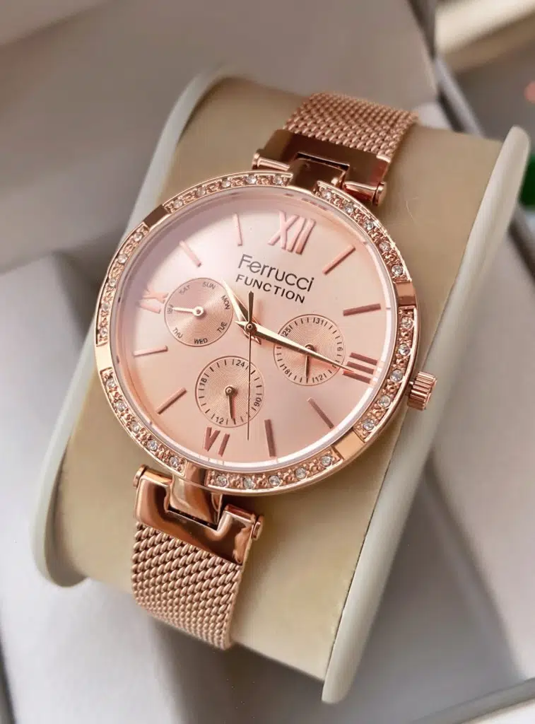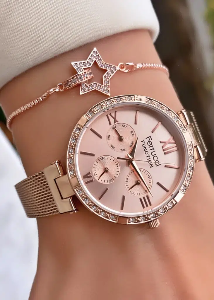 Zarafeti ve ışıltıyı bir araya getiren Ferrucci Function Rose Gold Kadın Kol Saati, modern çizgisiyle hem günlük hem de özel gün kombinleriniz için mükemmel bir seçimdir.