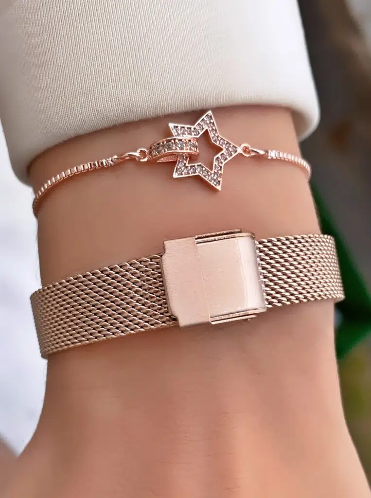 Set içinde bulunan taşlı yıldız figürlü bileklik, saate mükemmel uyum sağlar ve zarafetinizi tamamlar.