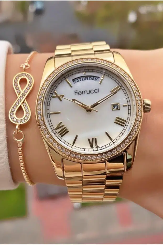 Ferrucci MRD11837 Altın Renk Çelik Kordon Kadın Kol Saati Bileklik Hediyeli 2 yıl boyunca garantilidir.