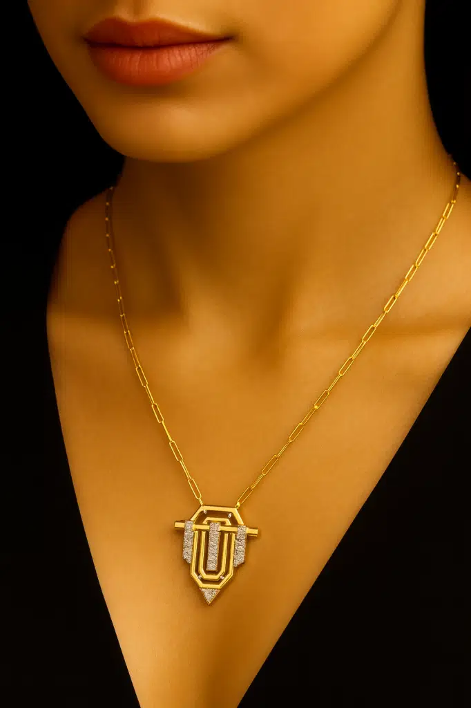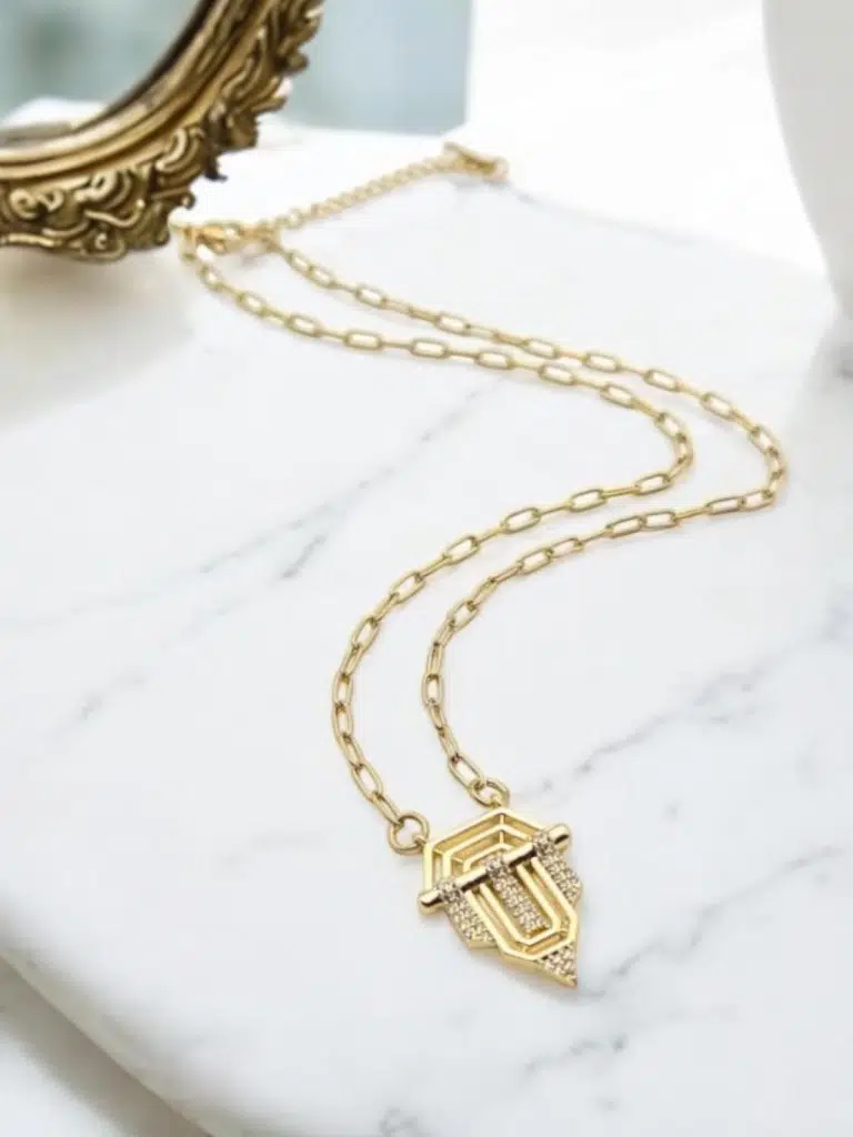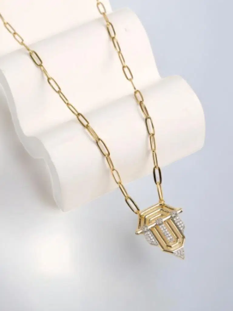 Geometrik detaylara sahip altın renk zincirli Merand kadın kolye, parlak taş işlemeleriyle modern bir şıklık sunar. Paslanmaz çelikten üretilmiş, kararma yapmayan bu zarif tasarım, günlük kombinler ve özel davetler için ideal bir aksesuardır.