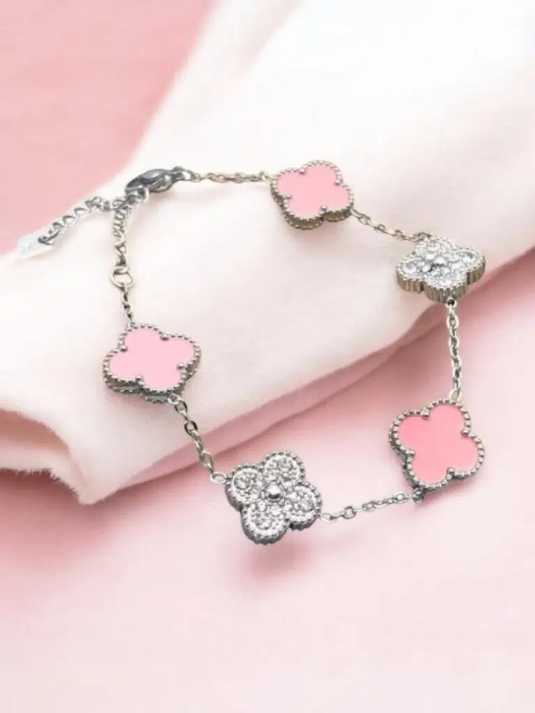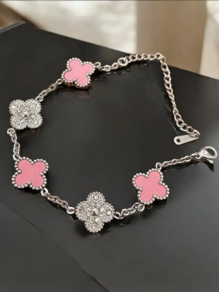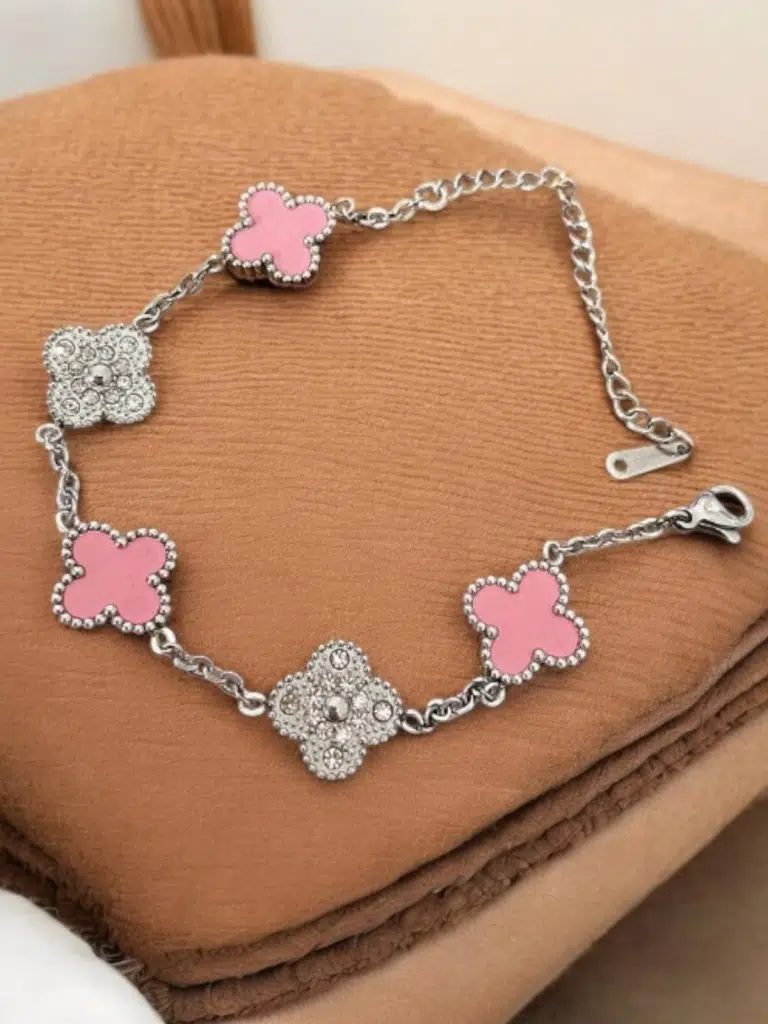 Pembe mine detayları ve taşlı yonca motifleriyle tasarlanan Merand kadın bileklik, zarif ve modern görünümüyle her kombine uyum sağlar. Paslanmaz çelikten üretilen, kararma yapmayan bu özel tasarım, günlük kullanım ve hediye için ideal bir aksesuardır.