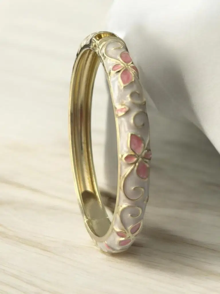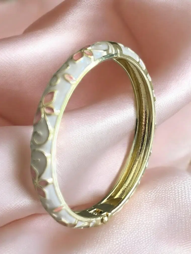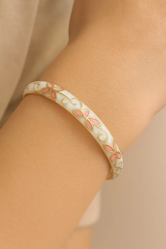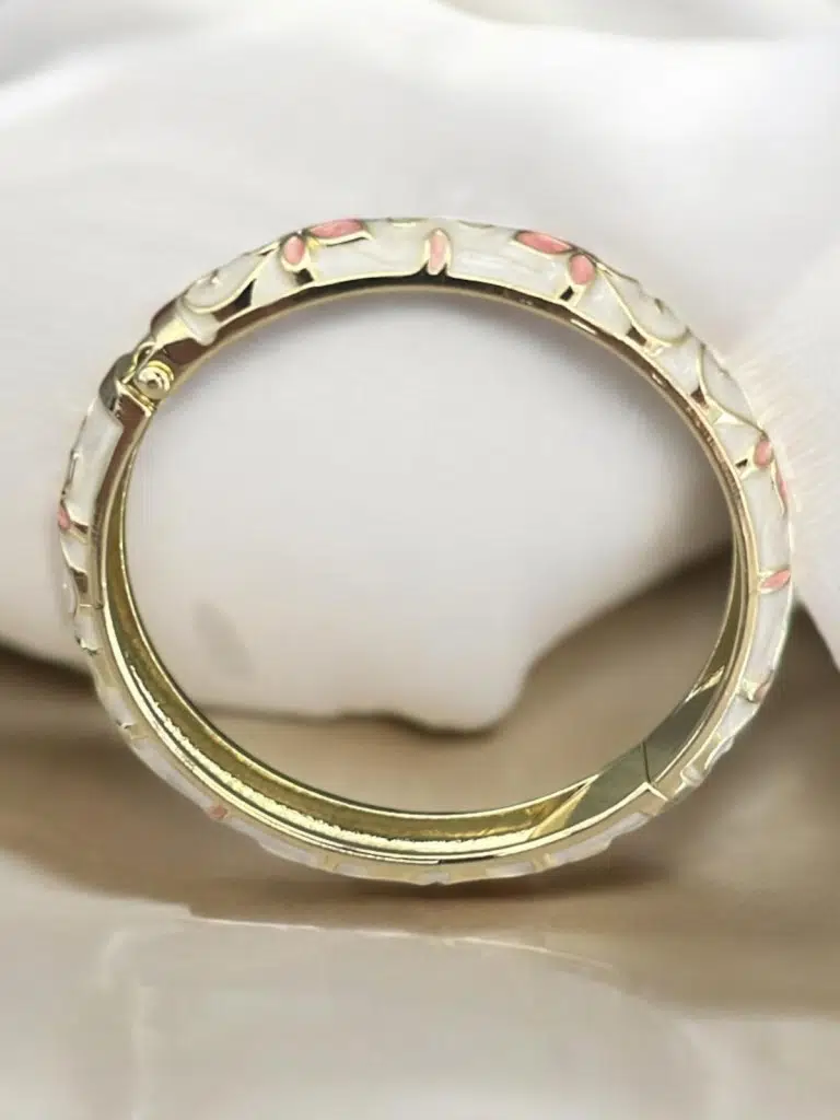 Kadınların zarafetini ön plana çıkaran beyaz mine kaplama çiçek desenli kelepçe bilezik, modern tasarımıyla dikkat çekiyor. Altın rengi metal üzerine işlenmiş pembe çiçek motifleri ve ince detaylı işlemeleriyle bileğinizde şık bir dokunuş sağlar. Gündelik kombinlerden özel davetlere kadar her stile uyum sağlayan bu zarif kelepçe bilezik, hafif yapısı ve rahat kullanımıyla gün boyu konfor sunar.