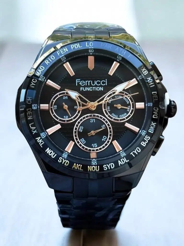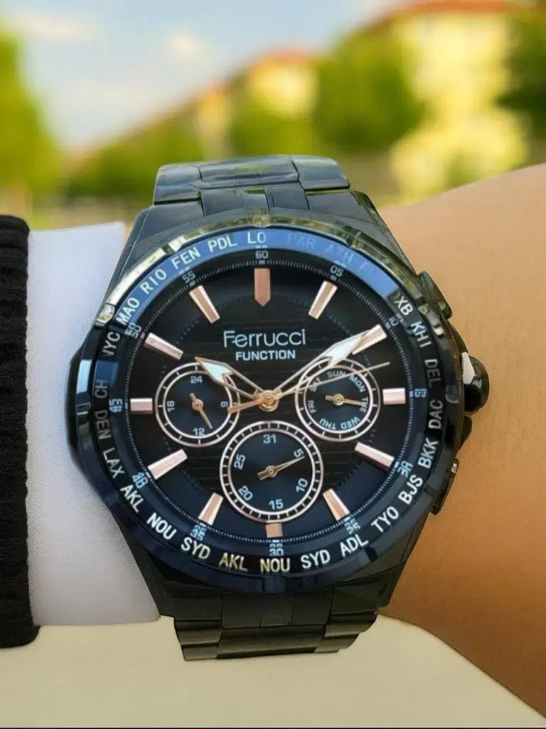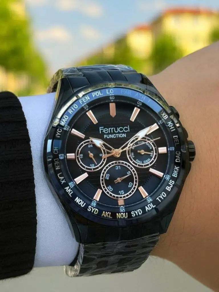 Modern ve güçlü tasarımıyla öne çıkan Ferrucci Erkek Kol Saati, siyah kadranı ve rose gold detaylarıyla şık bir görünüm sunar. Çevresinde yer alan dünya şehirleri göstergesi sayesinde seyahat edenler için fonksiyonel bir kullanım sağlar. Çok fonksiyonlu alt kadranları ile takvim, gün ve saat göstergesi sunarak pratiklik kazandırır.