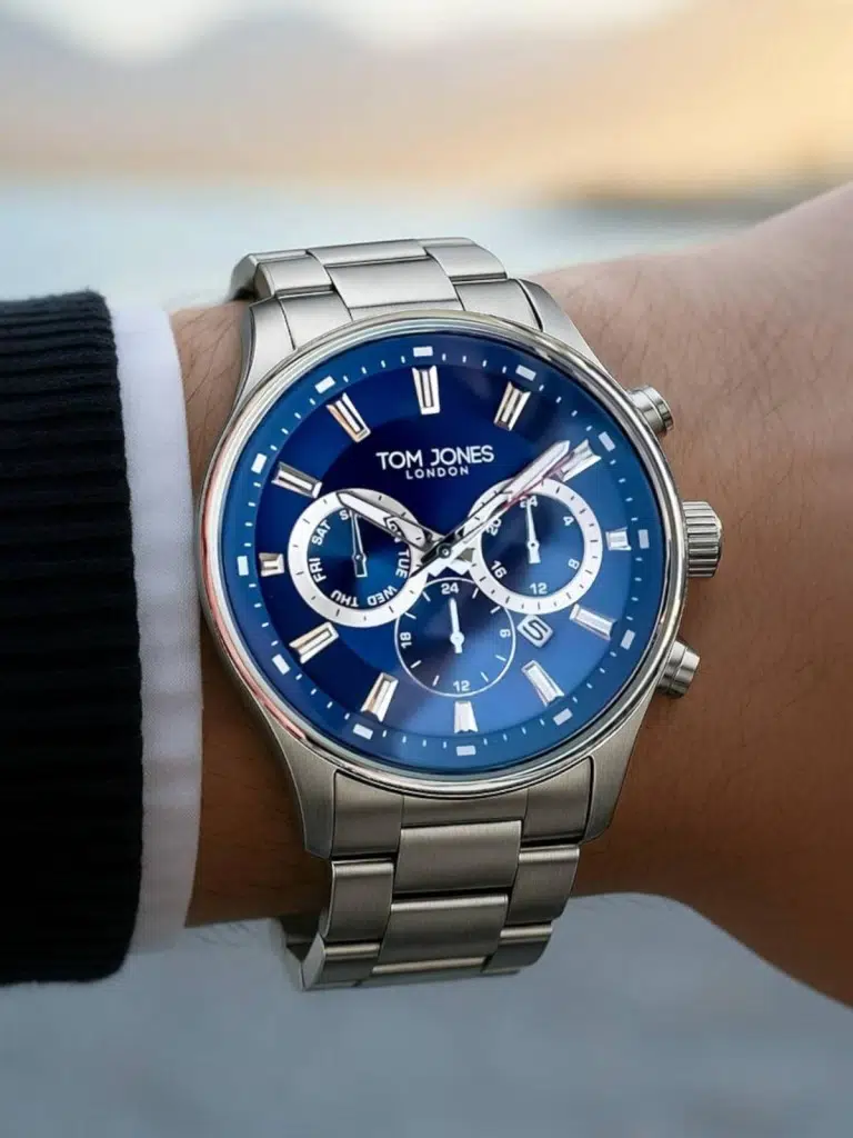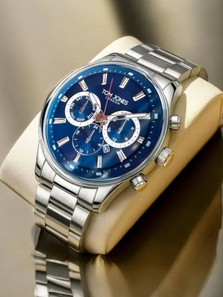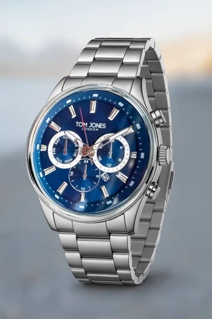Lacivert kadran ve çelik kordon uyumuyla şık bir görünüm sunar.