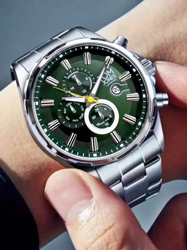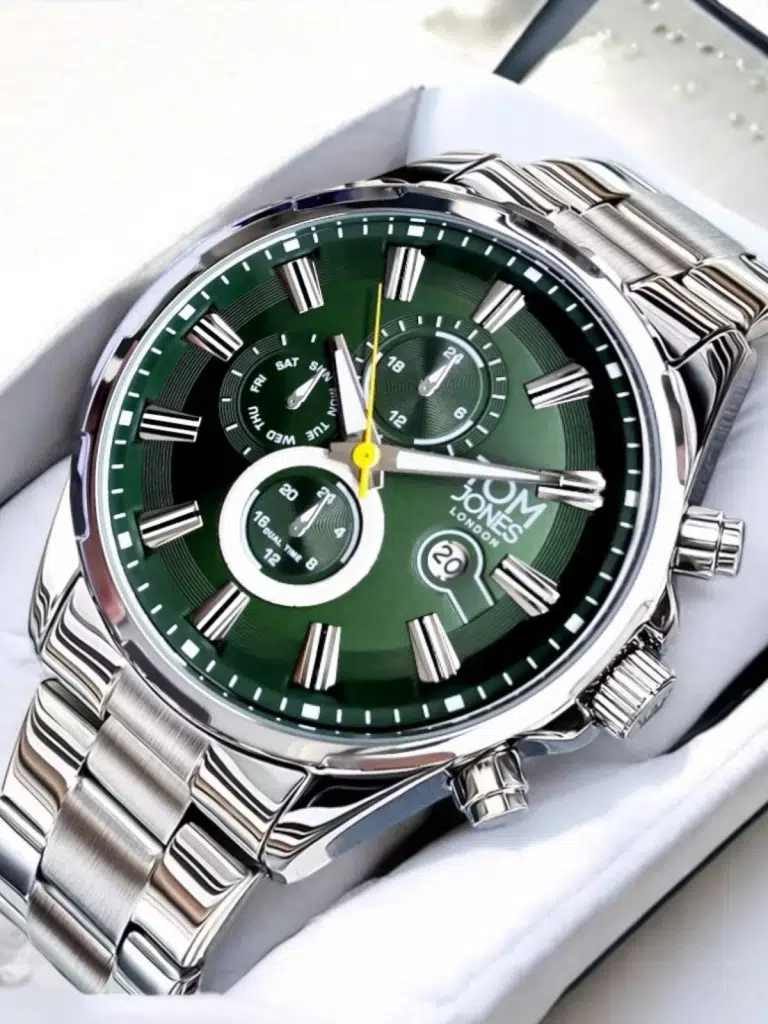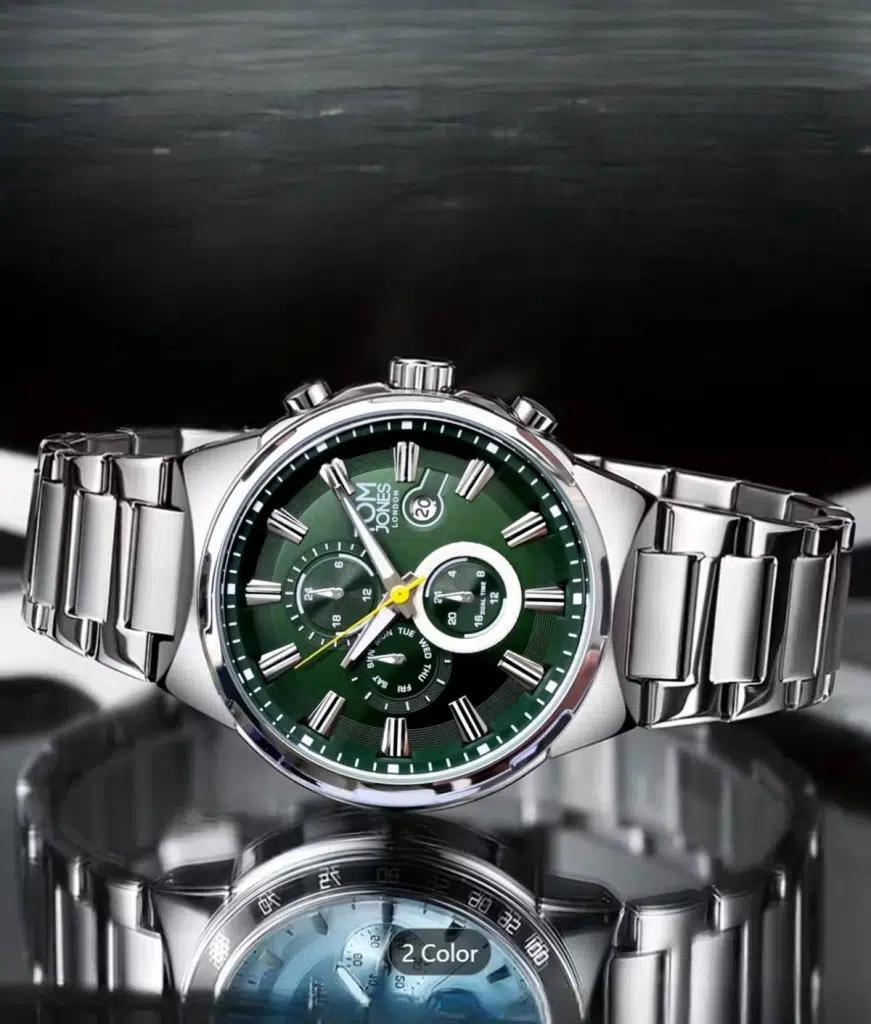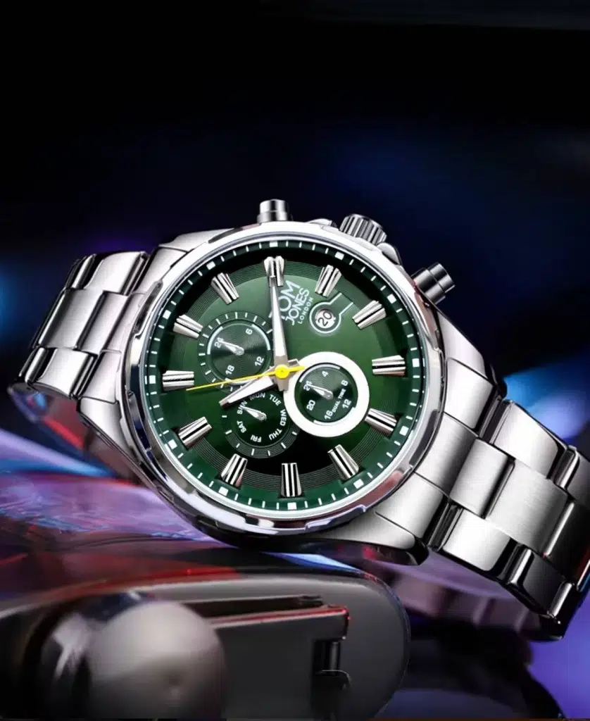 Yeşil kadran ve çelik kordon ile şıklığı ön plana çıkarır.