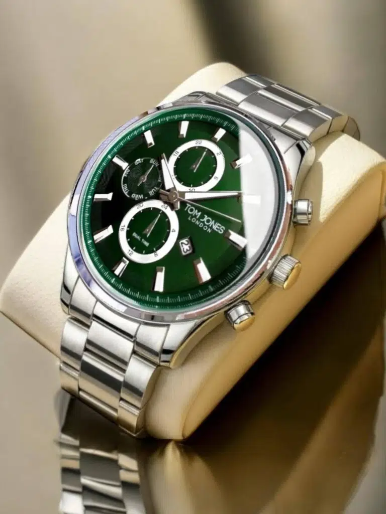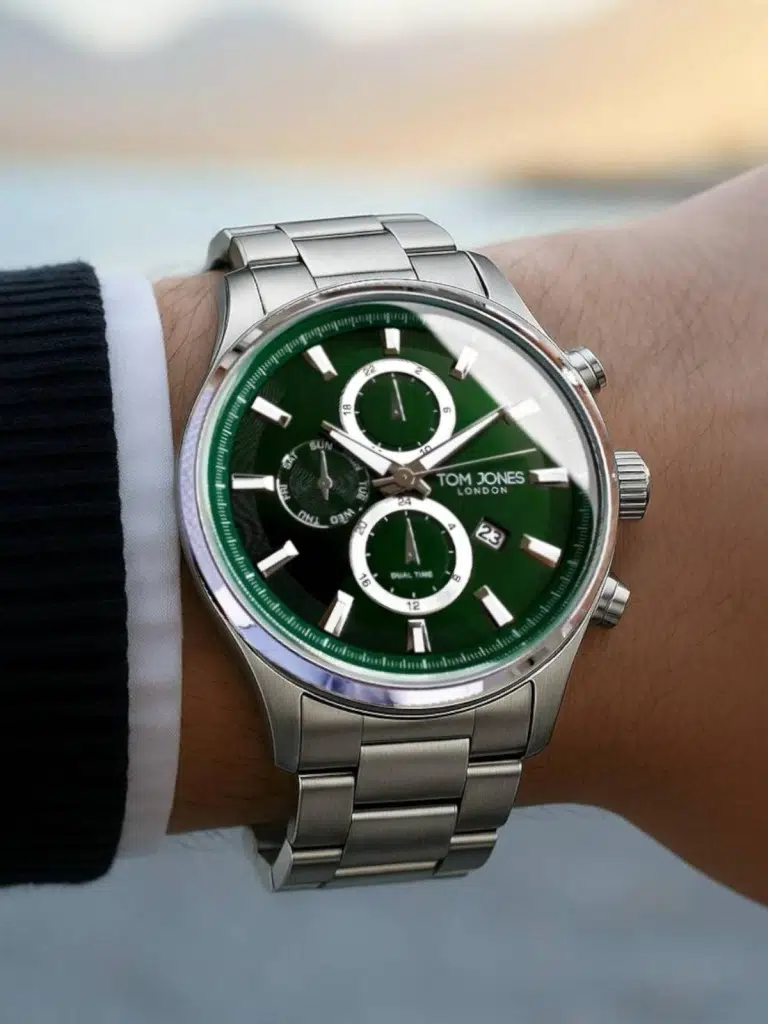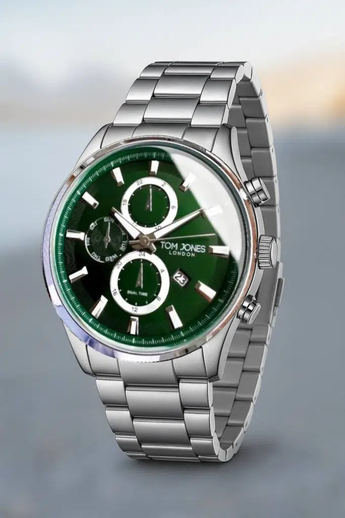 Yeşil kadran ve çelik kordon sayesinde hem klasik hem sportif bir tarz sunar.