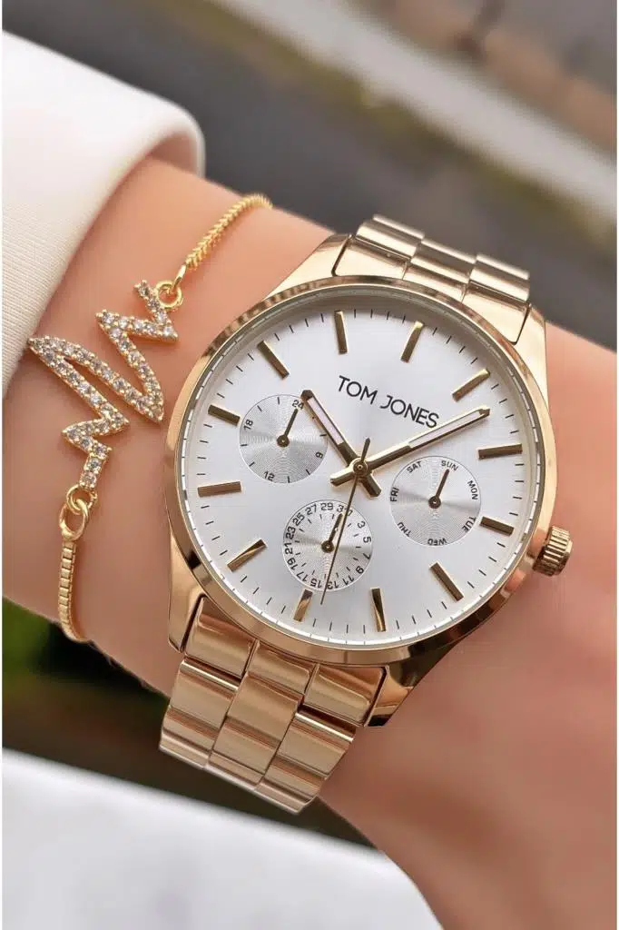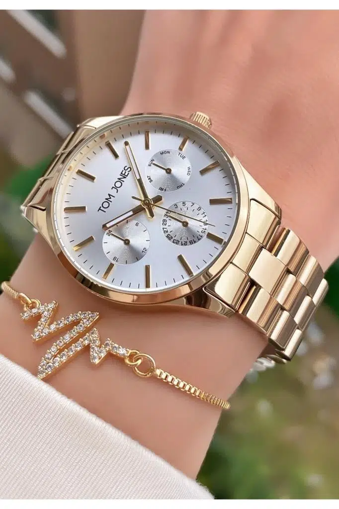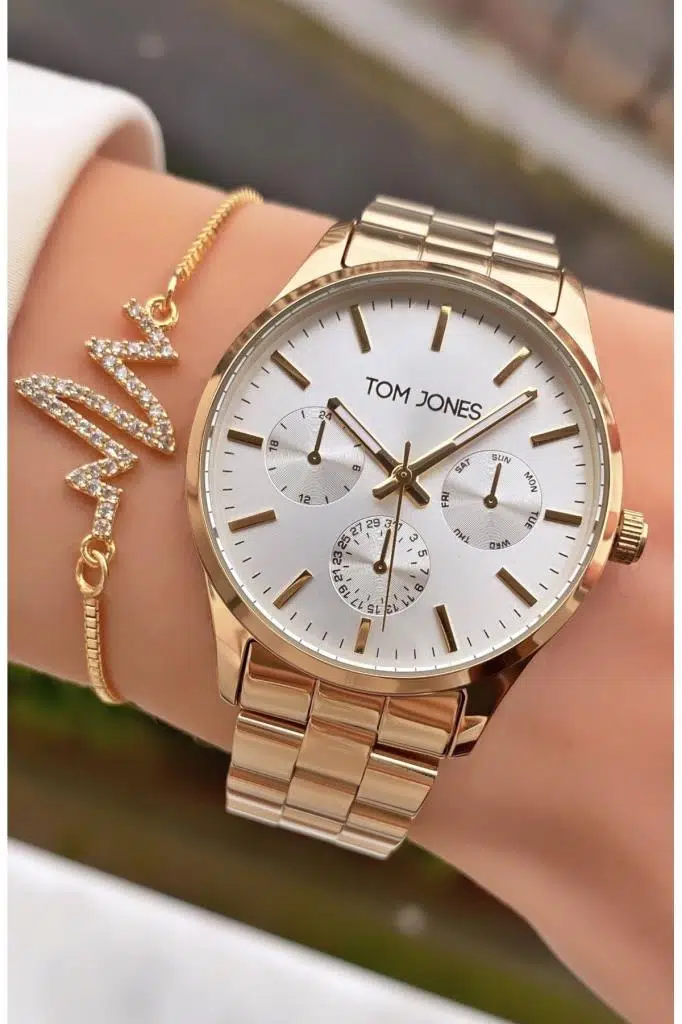 Tom Jones MRD11654 Altın Renk Büyük Kasa Kadın Kol Saati Bileklik Hediyeli 2 yıl boyunca garantilidir.
