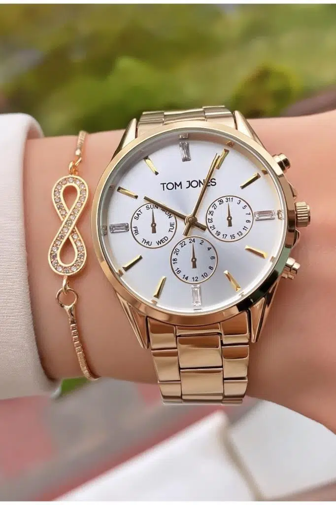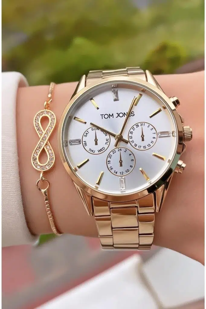 Tom Jones MRD11975 Altın Renk Büyük Kasa Kadın Kol Saati Bileklik Hediyeli 2 yıl boyunca garantilidir.